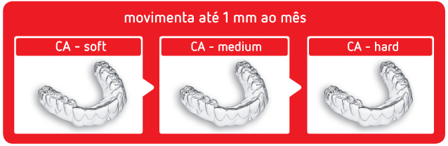 A cada mês, você deve usar três tipos diferentes de alinhadores transparentes com espessuras progressivas: